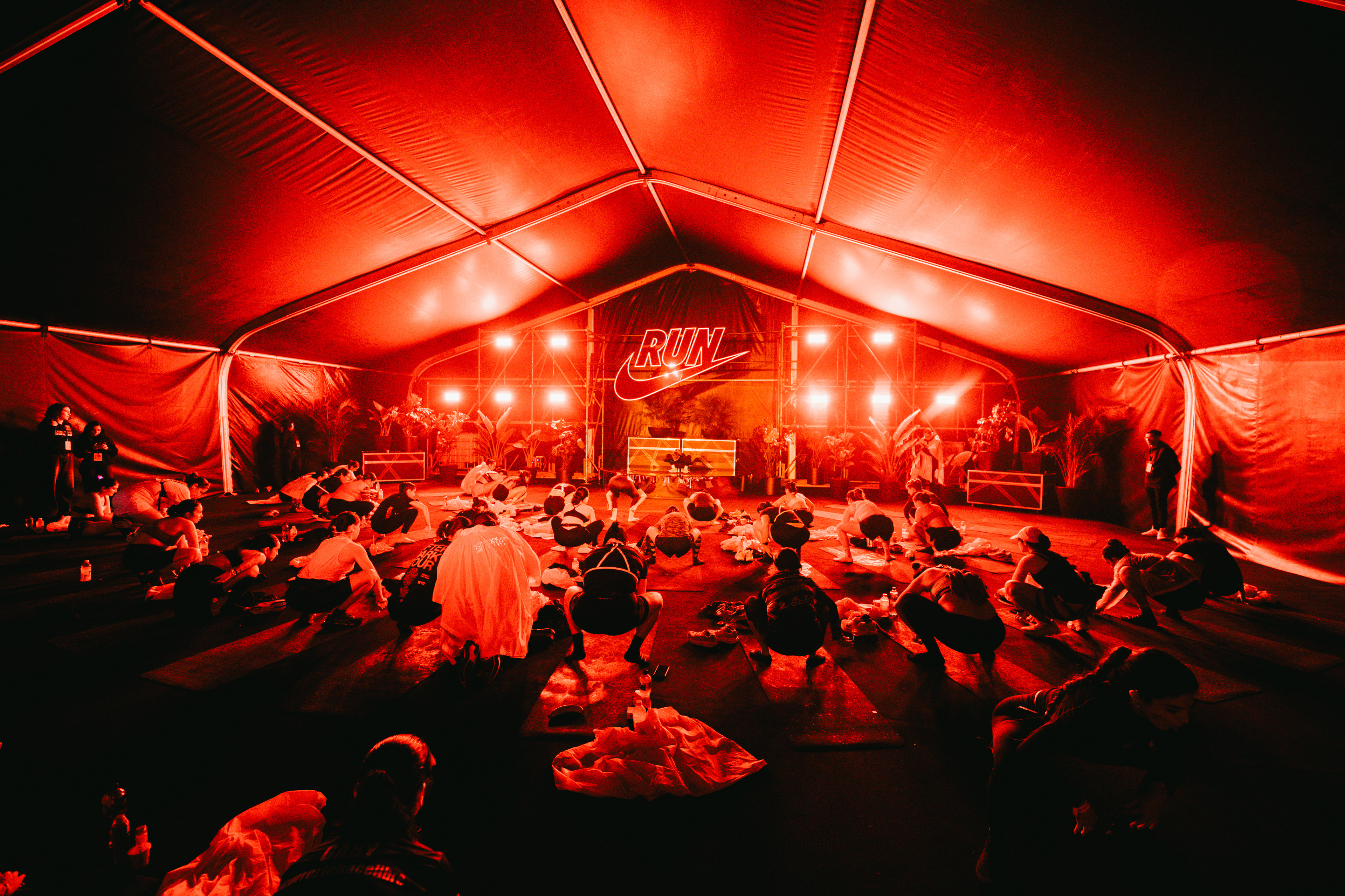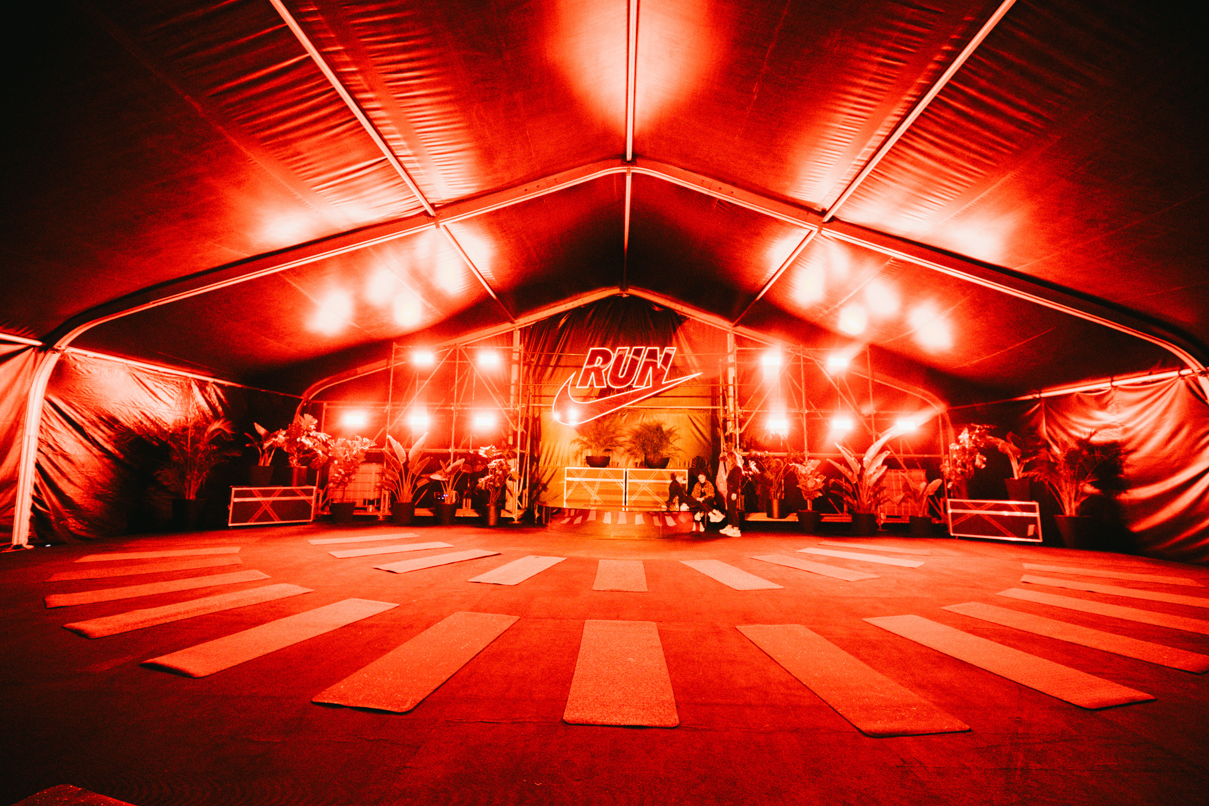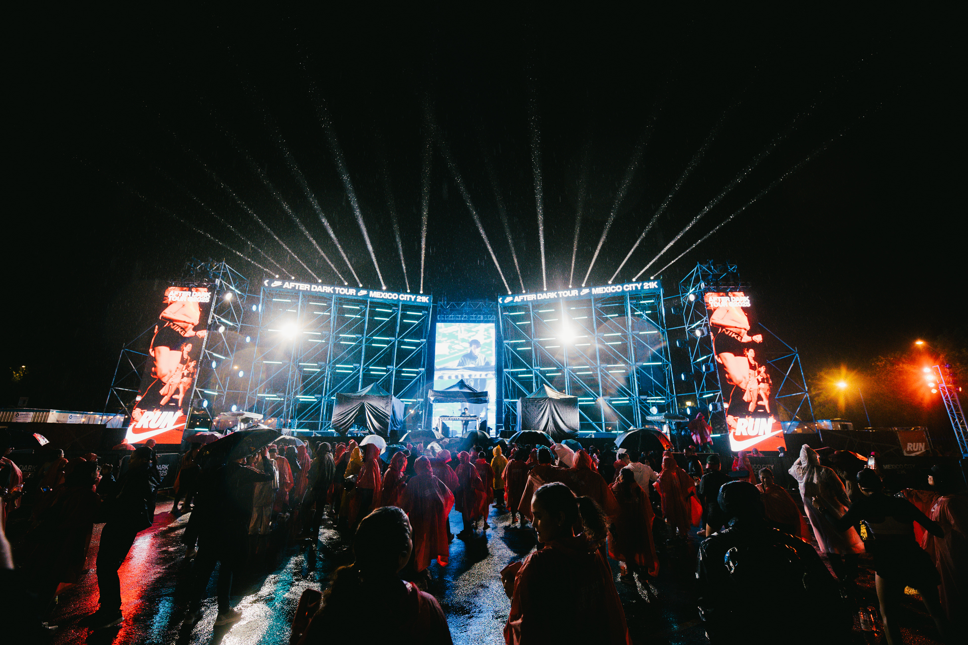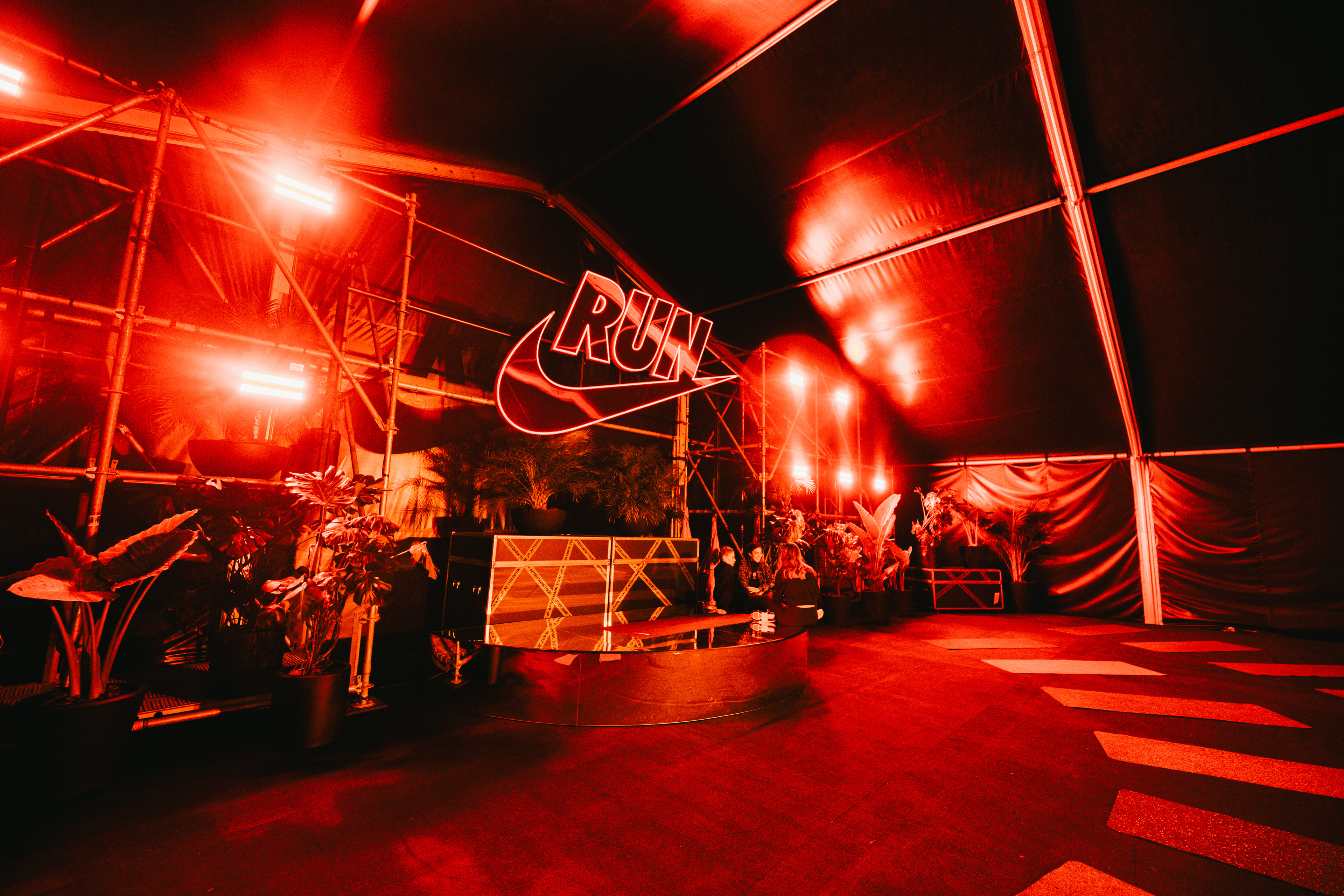 We designed a fully immersive post-race environment that lived and breathed Nike's After Dark visual identity—neon lighting systems, geometric stage design inspired by the iconic Nike RUN logo, modular structures that transformed the stadium grounds into a nightlife-meets-running-culture celebration.