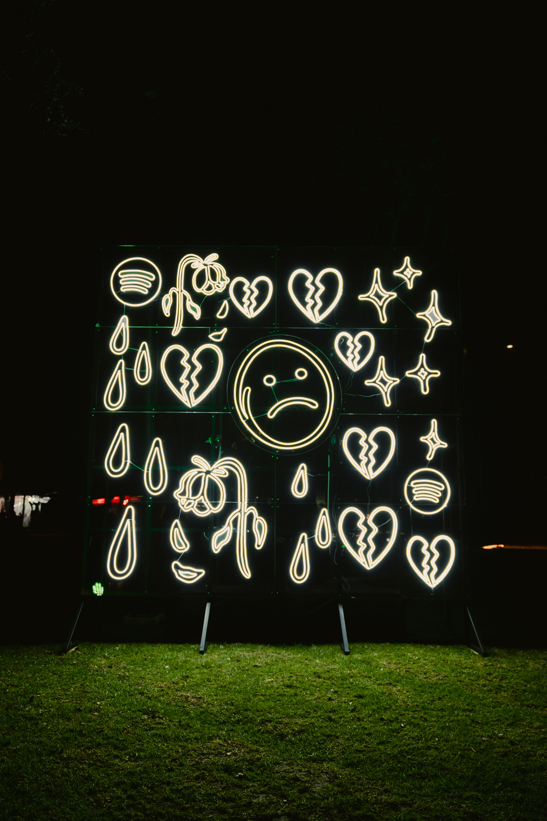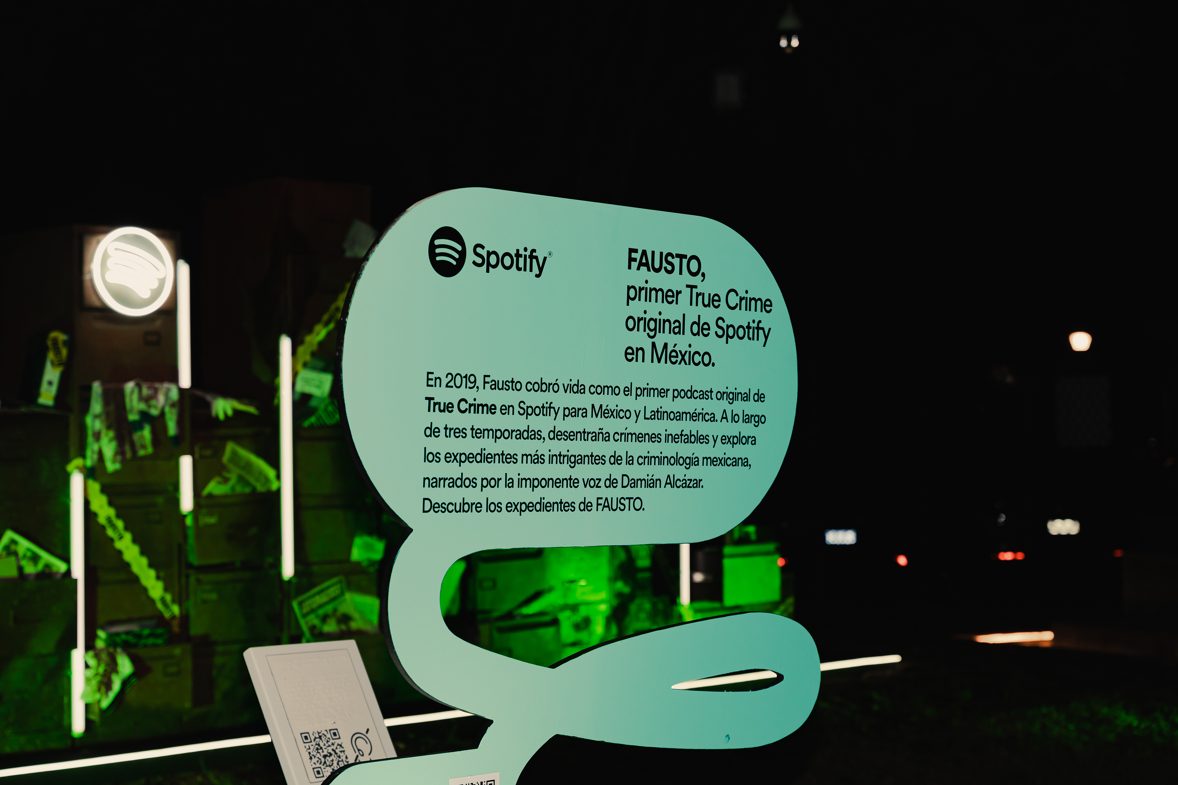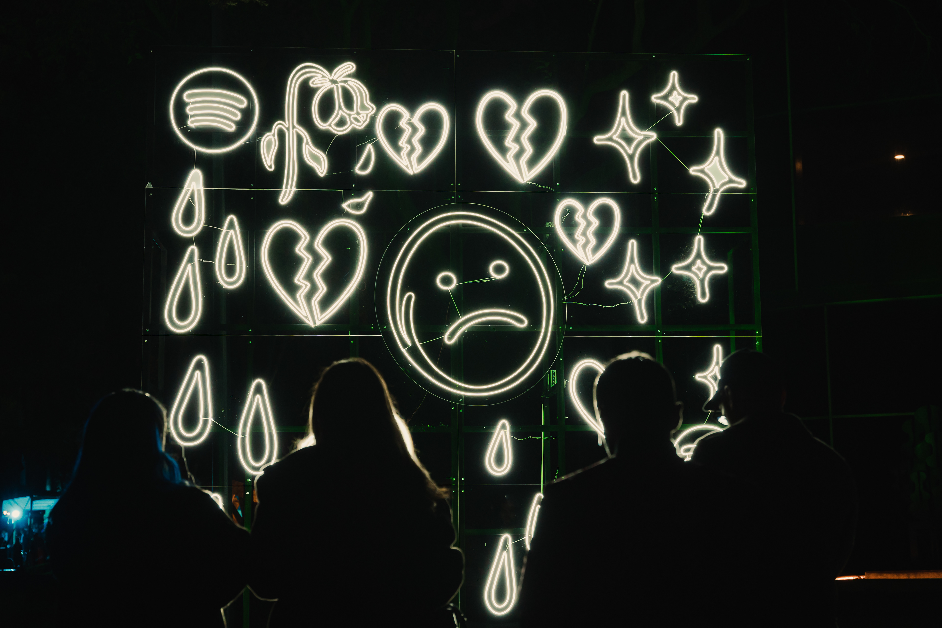 A giant deconstructed monolith representing Mexico City as #1 in worldwide streamings; the light emitted by minimalist neon figures symbolizing a new genre Spotify introduced to the music collection: sad sierreño; or a monument playing with perspectives, dedicated to Spotify's initiatives to amplify emerging female and male composers, among other artworks.