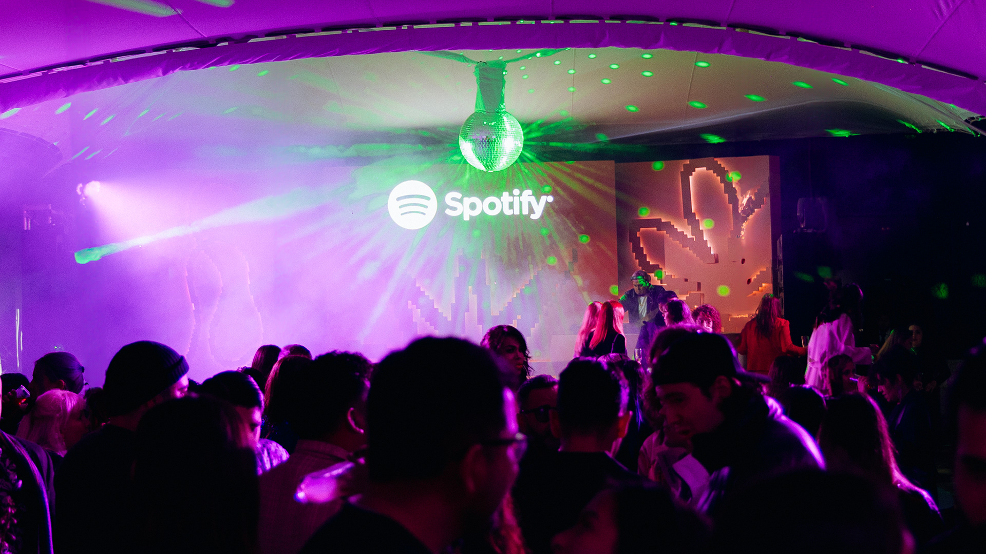 Spotify completed its art installation by interpreting its logo on a dance floor, DJ booth, stage, and décor that complemented the guest experience.
