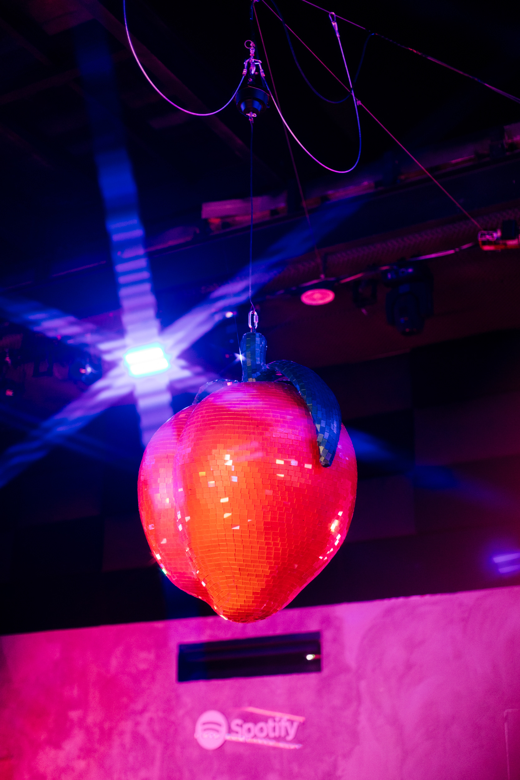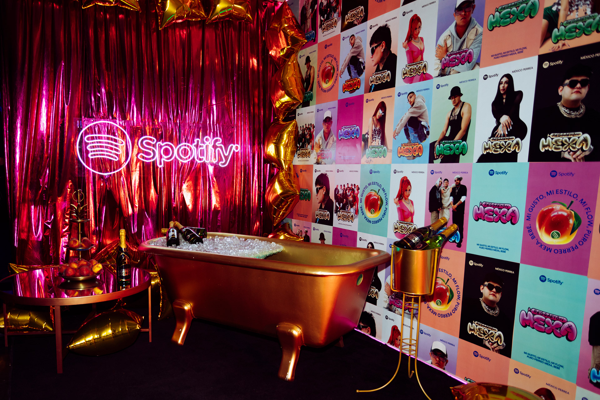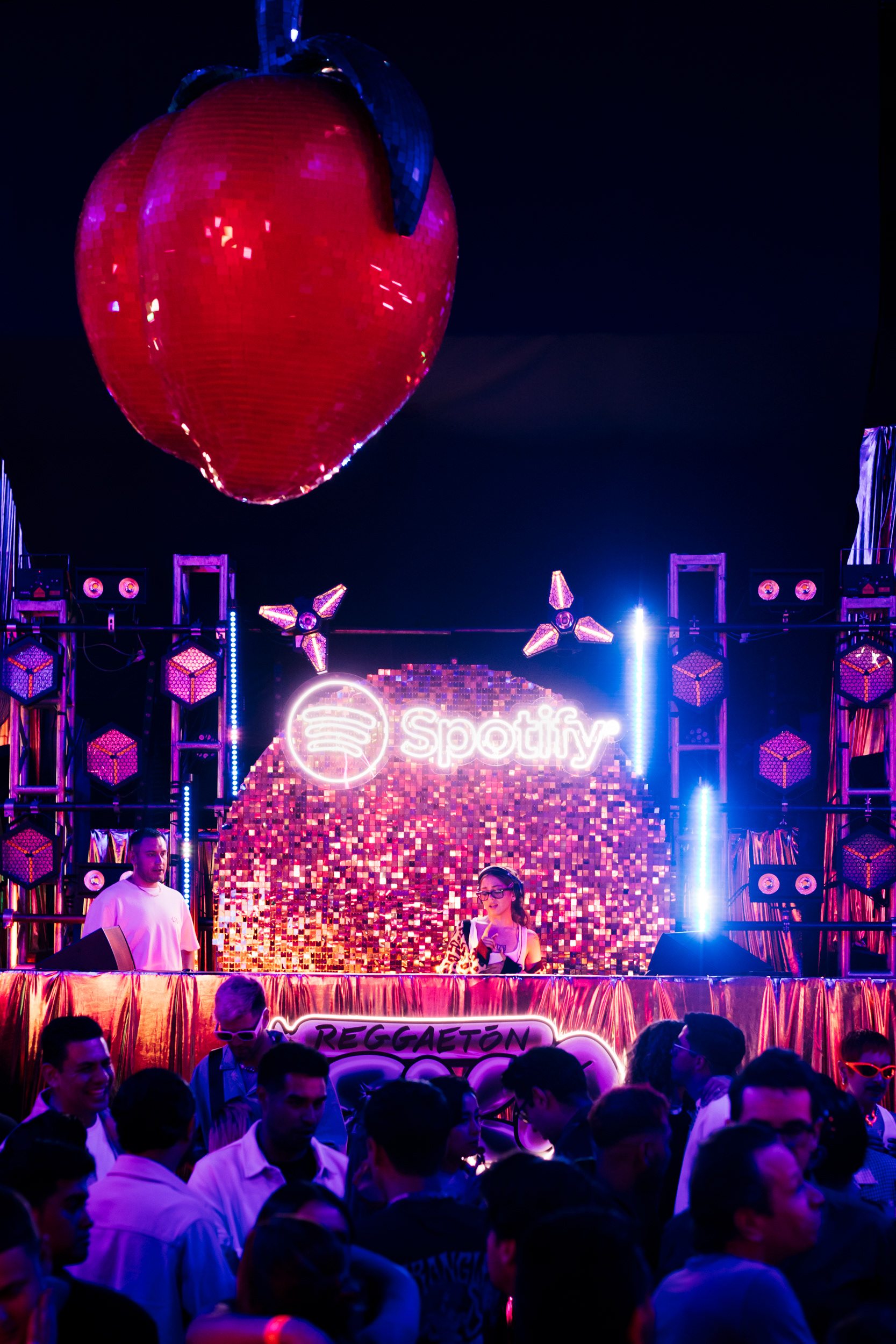 At the center of the celebration, a disco ball in the shape of a peach moved to the rhythm of the hips, while the flashes did not stop illuminating thematic installations that generated content in real time.